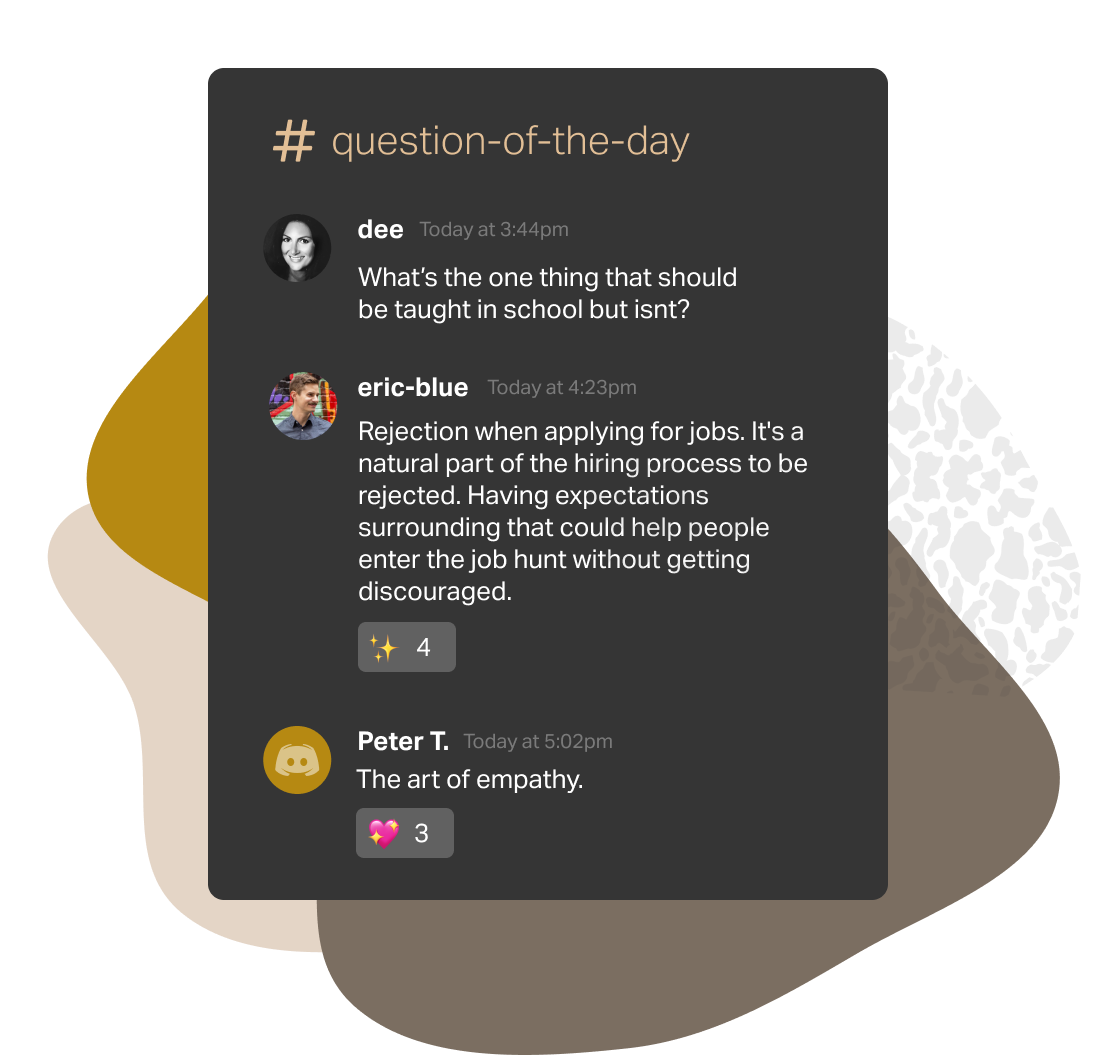 Connect with peers in our #water-cooler and #question-of-the-day channels, and so many more.